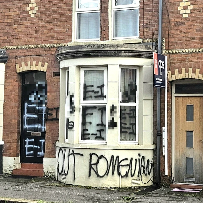 ”Duminică, 15 iunie, în jurul orei 12:35, s-a primit o sesizare privind apariția unor graffiti pe o proprietate. Considerăm însă că pagubele au fost cauzate cu ceva timp înainte de sesizarea poliției. Vopsea neagră a fost folosită pentru a acoperi peretele frontal, ferestrele de la parter și ușa de intrare a casei. Acest raport este tratat ca un act de vandalism motivat de ură și rugăm pe oricine are informații despre ceea ce s-a întâmplat să contacteze poliția la numărul 101 și să menționeze numărul de referință 619 15/06/25”, anunță Poliția.