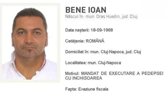 Omul de afaceri Ioan Bene, condamnat la 3 ani şi 8 luni la închisoare pentru dare de mită în dosarul fostului preşedinte al CJ Cluj, Horea Uioreanu, a fost dat în urmărire după ce nu a fost găsit pentru a fi încarcerat în Penitenciarul Gherla.