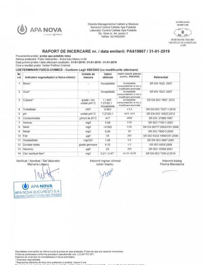 „Rezultatele monitorizării calităţii apei în Bucureşti în acest moment arată că concentraţia de clor rezidual în formă liberă nu a depăşit valoarea de 0.40 mg/l şi nu a fost mai mici de 0,10 mg/l”, anunţă Apa Nova într-un comunicat remis Mediafax, concentraţie care se menţine în limitele normale, între 0,10 – 0,50 mg /litru, conform legislaţiei.