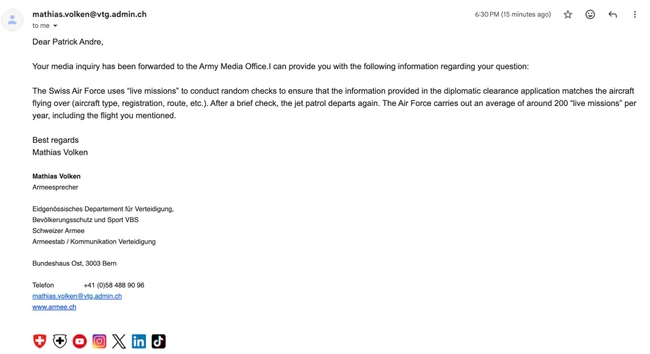 „Forțele Aeriene Elvețiene utilizează «live missions» pentru verificări aleatorii, menite să confirme că informațiile din autorizația diplomatică corespund aeronavei care tranzitează spațiul aerian (tipul aeronavei, înmatricularea, ruta). După o scurtă verificare, patrula își continuă misiunea. Forțele Aeriene efectuează aproximativ 200 de astfel de misiuni anual, inclusiv zborul menționat”, arată reprezentantul Armatei Elveției, potrivit răspunsului postat de jurnalist pe pagina sa de Facebook.