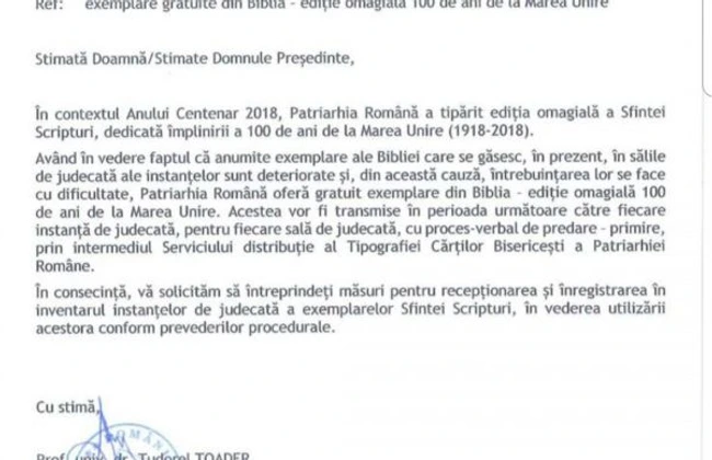 In consecinta, va solicitam sa intreprindeti masuri pentru receptionarea si inregistrarea in inventarul instantelor de judecata a exemplarelor Sfintei Scripturi, in vederea utilizarii acestora conform prevederilor procedurale", se arata in informarea transmisa de Tudorel Toader.