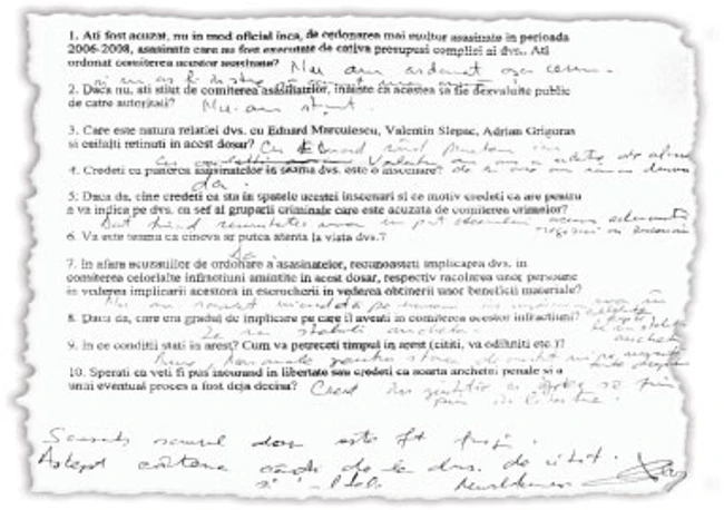 Reporterii „Adevărul de Seară" i-au transmis lui Băhăian cele zece întrebări miercurea trecută, iar Pantea i le-a înmânat vineri, 22 ianuarie, atunci când s-au întâlnit, la Curtea de Apel Bucureşti, la judecarea recursului făcut de Băhăian împotriva mandatului de arestare preventivă. Marţi seara, după ce şi-a reîntâlnit clientul, pe care l-a vizitat în arest, Pantea a luat documentul cu răspunsurile scrise, iar ieri ni l-a pus la dispoziţie.