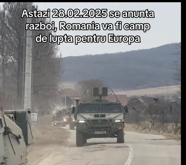„Astăzi, 28.02.2025, se anunţă război. România va fi câmp de luptă pentru Europa. Primul convoi militar ucrainean a intrat în România. Au ocupat o localitate din nordul ţării”, este mesajul care apare pe videoclip, pe Tik Tok.