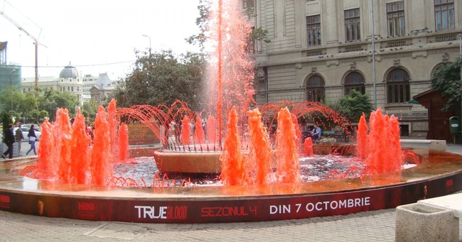 Trecătorii care au drum în centrul Capitalei constată că apa care curge are altă culoare, un roşu aprins precum sângele. Schimbarea are loc pentru că din 7 octombrie începe un nou sezon din serialul HBO- True Blood.