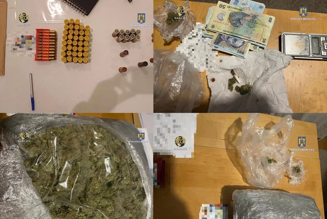 „Au fost descoperite și indisponibilizate aproximativ un kilogram de cannabis, o fiolă de fentanyl de 10 mililitri, un grinder, o cutie de lemn cu urme de materie vegetală, 76 de cartușe de vânătoare, deținute ilegal, 12.500 de lei, 3 telefoane mobile și diverse arme albe (cuțite, săbii, macete)”, se arată într-un comunicat al IGPR.