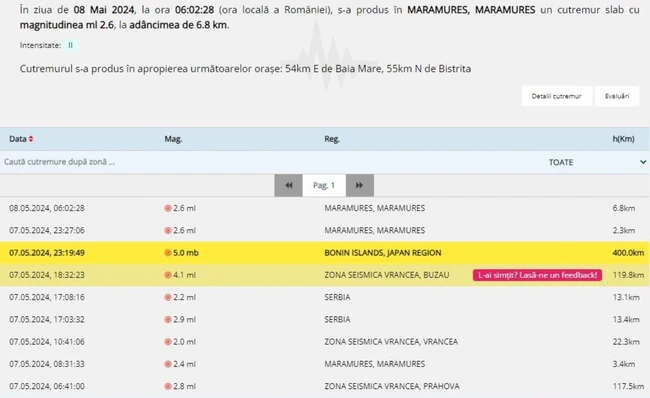 Primul dintre ele a fost înregistrat marţi dimineaţă, la ora 8.31. Produs la o adâncime de 3,4 kilometri, acesta a avut o magnitudine de 2,4 pe scara Richter, iar epicentrul a fost la 54 kilometri N de Bistriţa şi 55 kilometri S de Baia Mare.
