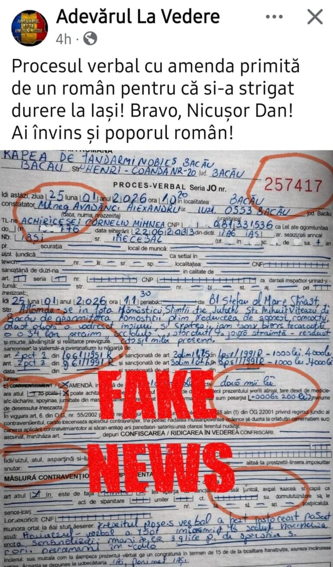 Potrivit documentului falsificat şi distribuit online, un cetăţean care ar fi participat la manifestările de 24 ianuarie în Iaşi ar fi fost amendat de Jandarmeria Bacău cu suma de 2.000 de lei, însă procesul-verbal conţine o serie de erori care denotă faptul că a fost generat automat cu AI.