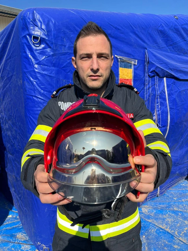 Bărbatul cu „cască roșie“ este „colegul nostru din DSU, ofițer de presă în această misiune de sprijin în Turcia, locotenent Bogdan Toma. Luând legătura cu al nostru coleg Bogdan, pentru a afla mai multe informații legate de acest caz, povestea a devenit și mai emoționantă.
