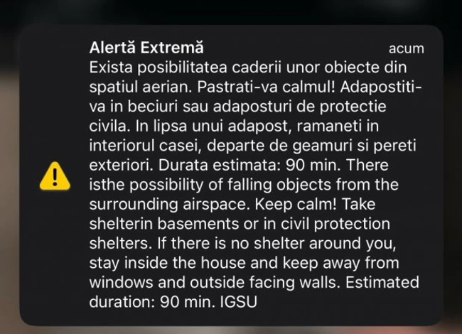 "În urmă cu puțin timp a fost emis un mesaj RO-alert de avertizare despre posibilitatea căderii unor obiecte din spațiul aerian”, se arată în mesajul transmis de ISU Tulcea, anunță Antena 3.