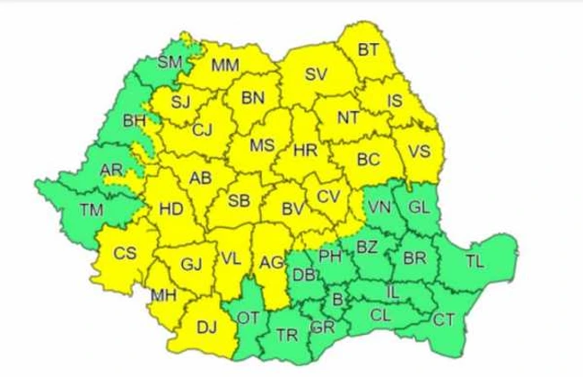ANM a emis un Cod galben de instabilitate atmosferică, temporar accentuată în zonele de deal şi de munte, în Maramureş, Transilvania, cea mai mare parte a Olteniei şi Moldovei şi nord-vestul Munteniei, valabil pe parcursul zilei de astăzi, în intervalul orar 10.00- 18:00.