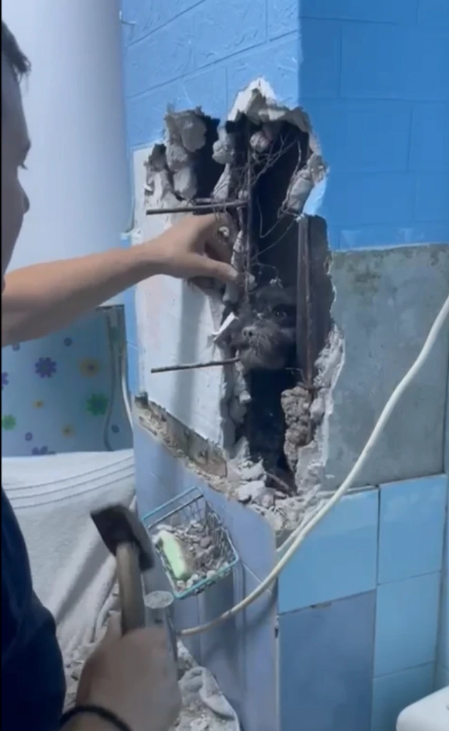 Un bărbat a sunat la 112 să anunțe că i-a dispărut căţelul. Pompierii l-au găsit în gura de vizitare de sub chiuveta din baia familiei, însă au fost nevoiţi să spargă zidul pentru a-l salva.