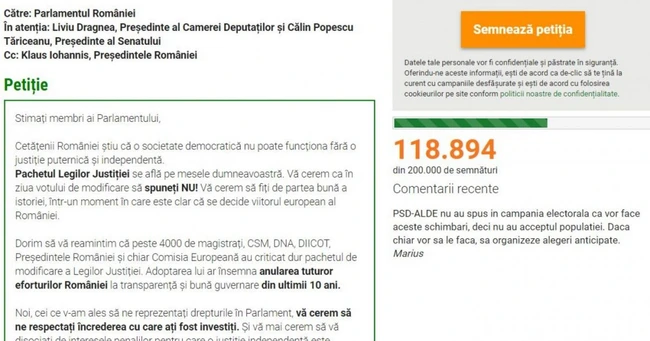 0O petiţie online iniţiată de către comunitatea Declic îndreptată împotriva modificărilor făcute de Parlament la Legile Justiţiei şi modificările propuse a fi aduse Codului Penal şi de Procedură Penală a strâns, până joi dimineaţă, circa 118.000 de semnături.