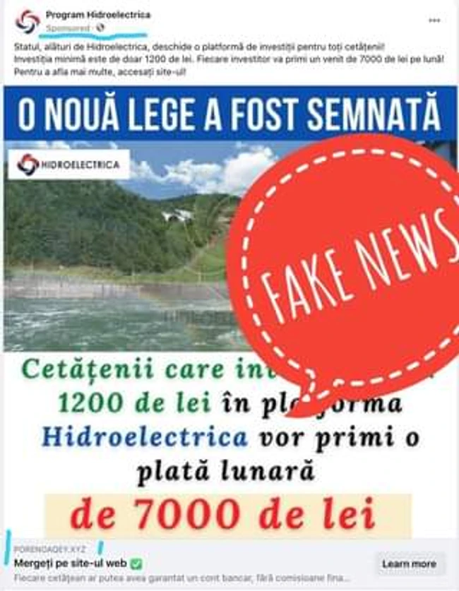 Scam-urile de acest timp sunt foarte frecvente pe rețelele de socializare. În acest caz, este dat exemplul unui anunț Fake ce anunță deschiderea unei platforme pentru cetățeni de către Hidroelectrica. Anunțul promite că cei care vor investi câte 1200 de lei, vor primi 7000 de lei lunar.