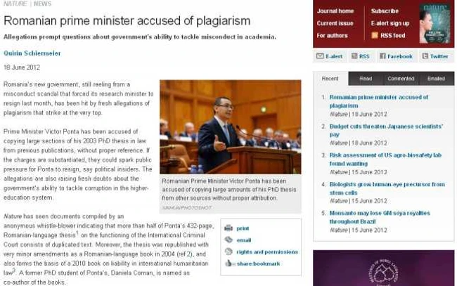 Potrivit revistei Nature, „premierul Victor Ponta a fost acuzat că a copiat largi secţiuni ale tezei de doctorat în drept din 2003, fără a cita sursele bibliografice corespunzătoare. Dacă acuzaţiile se vor dovedi întemeiate, ar putea apărea presiuni publice pentru demisia lui Ponta, conform unor surse politice. În plus, acuzaţiile ridică noi dubii în legătură cu capacitatea Guvernului de combatere a corupţiei în învăţământul superior".