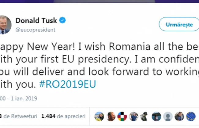0Preşedintele Consiliului European Donald Tusk a felicitat marţi România, cu ocazia preluării preşedinţiei Consiliului UE. „La mulţi ani! Cele mai bune urări României cu ocazia primei sale preşedinţii a UE. Sunt încrezător că veţi reuşi şi aştept cu nerăbdare să colaborez cu dumneavoastră'', a scris Tusk pe pagina sa oficială de Twitter.