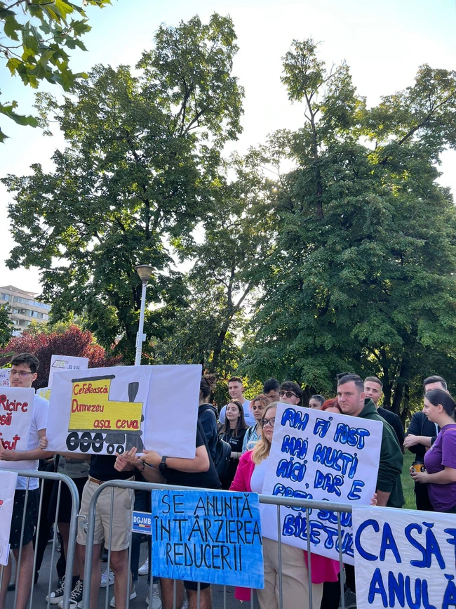 „Se anunță întârzierea reducerii”, „Am fi fost mai mulți aici, dar e prea scump biletul”, „Prețuri de 2023, condiții de 1880”, au fost mesajele scrise pe pancartele protestatarilor. Evenimentul a fost organizat de Uniunea Studenților din România.