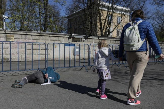 În faţa Ambasadei Rusiei, un bărbat a protestat faţă de crimele de la Bucea întinzându-se pe jos, cu mâinile legate la spate, aşa cum au fost găsite trupurile unora dintre civilii ucişi de trupele ruseşti.