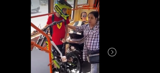 Postarea numită „Două generații, două educații, două intelecte” a fost publicată pe rețelele sociale și a devenit virală. O călătoare îl apucă pe băiat de cască și trage de ea, adresându-i injurii pentru că s-a urcat cu bicicleta în autobuz. El îi răspunde acesteia că nu are dreptul să pună mâna pe el și că în mijlocul de transport sunt camere de supraveghere, care vor ajunge la Poliție.