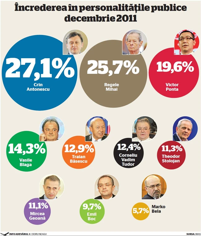 Regele Mihai are o cotă de încredere de 25,7% în luna decembrie 2011, potrivit sondajului realizat de IMAS pentru ziarul „Adevărul". Popularitatea Maiestăţii Sale depăşeşte cota de încredere cumulată de preşedintele Traian Băsescu - 12,9% împreună cu premierul Emil Boc - 9,7%. Regele este depăşit, la capitolul încredere, în luna decembrie, doar de preşedintele PNL Crin Antonescu, cotat cu 27,1%. Dintre personalităţile măsurate de IMAS în 2011, doar Mugur Isărescu, cotat în iunie cu 32,2%, l-a mai depăşit pe Rege.