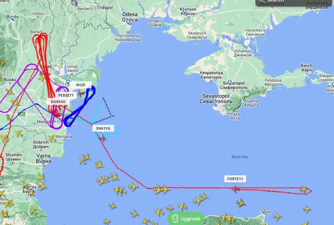 Apoi, decolată din Sicilia, puternica dronă americană Northrop Grumman RQ-4B Global Hawk cu indicativul FORTE11 și-a făcut din nou simțită prezența deasupra României pentru a spiona toate mișcările rușilor în Ucraina. La un moment dat, drona a ieșit adânc și pe Marea Neagră, dar a ținut un curs la o distanță mai mare față de Crimeea.