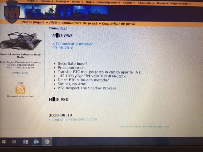 „Securitate bună? Presupun că da. Transfer de BTC mai jos (asta în caz că apar la TV). De ce BTC şi nu altă metodă? Simplu, RIP ANAF. PS: Respect The Shadow Brokers”, este mesajul care a apărut în comunicat.