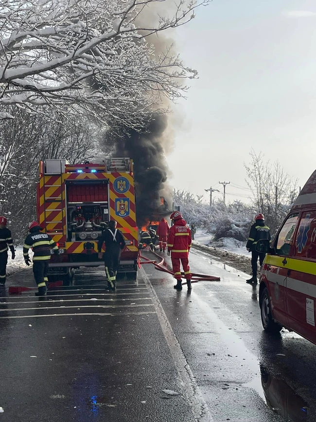 0Un autotren care transporta opt autoturisme a fost cuprins de flăcări în mers, pe DN 72, în zona localității I.L. Caragiale. Incidentul a avut loc pe un sector de drum drept, unde carosabilul era curățat de zăpadă.
