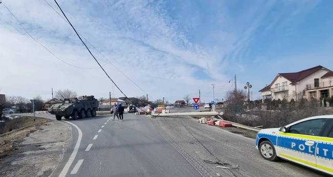 Un transportor militar blindat, condus de o tânără de 21 de ani, a lovit un stâlp de electricitate în Olt