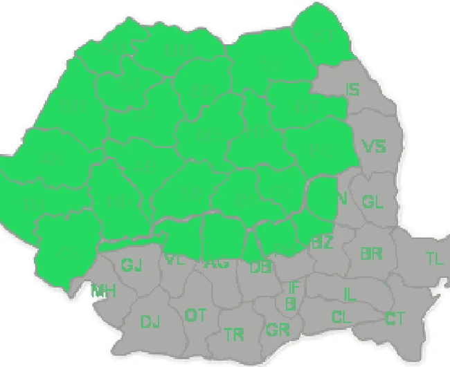 Harta de mai jos arată judeţele afectate de caniculă, marcate cu gri