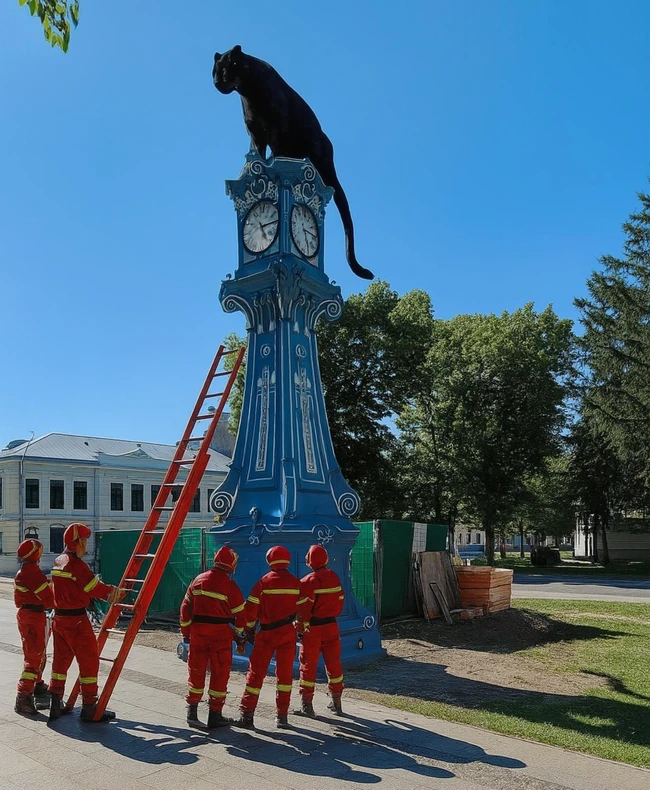 Instituția a publicat o imagine editată în care mai mulți pompieri escaladează, cu scara din dotare, un copac în care se vede o panteră, aparent în bună stare și cooperantă.