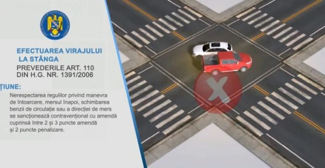 „În situaţiile în care există benzi speciale pentru executarea manevrei, schimbarea direcţiei de deplasare se face prin stânga centrului imaginar al intersecţiei, iar dacă există un marcaj de ghidare, cu respectarea semnificaţiei acestuia“, precizează Poliţia Rutieră.