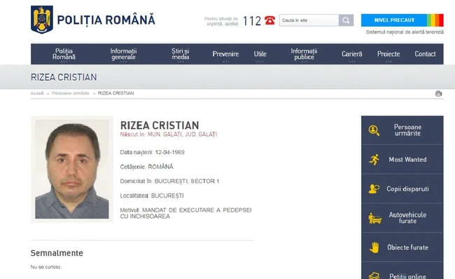 0Fotografia lui Cristian Rizea a fost afişată pe site-ul Poliţiei Române, la secţiunea ”Urmăriri”, după ce fostul deputat a fost condamnat definitiv, în urmă cu o lună, de instanţa supremă la 4 ani şi 8 luni de închisoare cu executare.