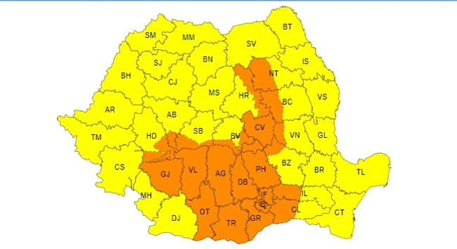 Un Cod Portocaliu intră în vigoare duminică, 29 septembrie, ora 10,00, fiind avalbil până luni la priânz. Vor fi ploi torențiale, abundente, cantitățile de apă care se aștepată putând ajunge la 100 litri/m.p.. Zonele vizate sunt: nordul și estul Olteniei, cea mai mare parte a Munteniei, Carpații Meridionali și Orientali