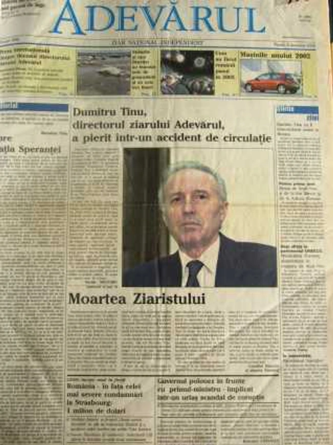 Lucrurile aveau să se schimbe începând cu ianuarie 2003, când „Adevărul“ anunţa pe prima pagină: „Dumitru Tinu, directorul ziarului Adevărul, a pierit într-un accident de circulaţie“. În articol se arăta că „Dumitru Tinu a sărbătorit cu familia intrarea în Noul An, din care n-a apucat să trăiască nici zece ore. S-a retras devreme de la petrecere, la 12.40, iar dimineaţa a plecat, la volanul maşinii personale, spre una din staţiunile de pe Valea Prahovei, unde dorea să schieze.