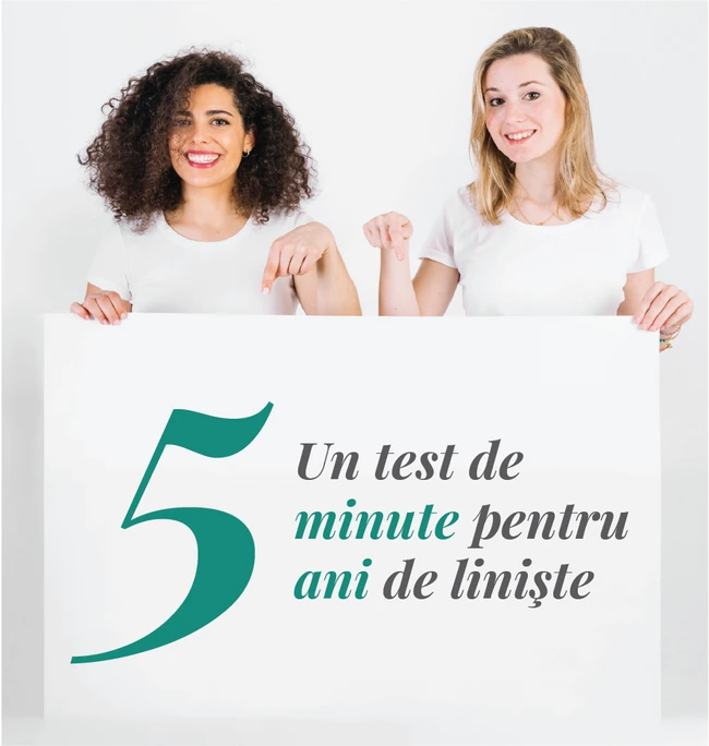 Programează-te ACUM, pentru un test gratuit de screening al cancerului de col uterin! Test Babeş-Papanicolaou dacă ai vârsta cuprinsă între 24-29 de ani și test HPV dacă ai vârsta cuprinsă între 30-64 de ani.