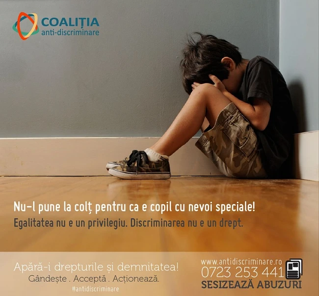 Copiii cu dizabilităţi din România sunt discriminaţi zilnic, priviţi cu neîncredere, daţi la o parte, puşi pe bară sau neacceptaţi în şcolile obişnuite. Pentru că aceste situaţii nu pot fi trecute cu vederea, Coaliţia anti-discriminare oferă consiliere juridică online în mod gratuit tuturor celor discriminaţi şi te încurajează să sesizezi online cazurile de discriminare pe portalul antidiscriminare.ro.
