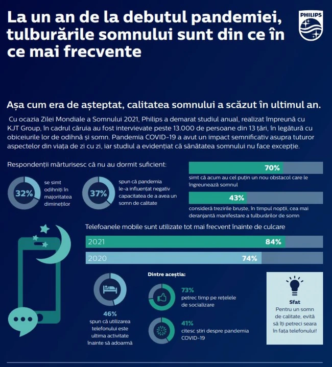 Oricine crede că este expus riscului de apnee în somn poate vizita site-ul Philips pentru a participa la un test online de simptome şi pentru a lua legătura cu un profesionist din domeniul sănătăţii. Cele mai recente descoperiri din studiul global privind calitatea somnului consolidează şi mai mult angajamentul companiei de a dezvolta soluţii dovedite clinic, care să le permită celor care trăiesc cu apnee în somn şi celor care se confruntă cu alte probleme de somn să îşi recapete controlul asupra sănătăţii. De peste 35 de ani, Philips studiază somnul într-o manieră holistică, colectând date de la un număr extins de pacienţi, date ce însumează milioane de nopţi de somn, pentru a înţelege mai bine modul în care natura somnului afectează sănătatea. Astăzi, portofoliul Philips cu soluţii pentru un somn calitativ este în creştere şi abordează în mod colectiv peste 80% din problemele de somn cunoscute. Aceste soluţii şi servicii sunt susţinute de cercetări clinice şi date tehnice şi oferă îngrijire personalizată celor care le folosesc. Virusul COVID-19 a avut un impact semnificativ asupra industriei medicale, iar îngrijirea somnului nu este o excepţie.