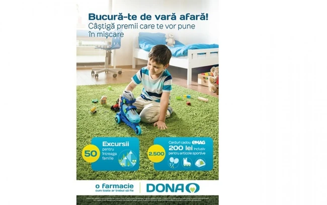 Campania a debutat în luna iunie atât în reţeaua naţională de farmacii DONA, cât şi pe www.donaonline.ro/promotii/. Participanţii la promoţie pot câştiga zilnic unul dintre premiile campaniei, ce îi pot pune în mişcare: 50 de excursii pentru întreaga familie şi 2500 de carduri-cadou în valoare de 200 lei inclusiv pentru articole sportive, pe care aceştia şi le pot achiziţiona pe www.emag.ro