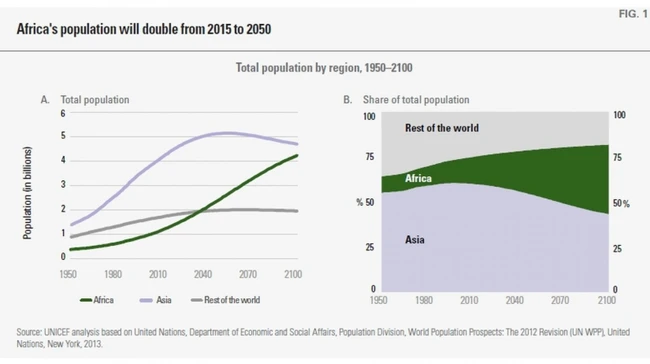 Acest câştig se va datora, în principal, creşterii populaţiei Africii, care potrivit raportului Fondului Naţiunilor Unite pentru Copii (UNICEF) va continua să crească în mod semnificativ. Astfel, de la 1,2 miliarde de locuitorilor, numărul oamenilor care va trăi pe continent african se va dubla până la jumătatea secolului şi va ajunge la 4,2 miliarde până în 2100.