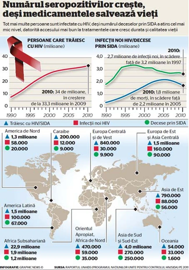 034 de milioane de oameni erau seropozitivi anul trecut. Peste 10.000 dintre ei sunt români. Conform datelor oferite de Institutul Naţional de Boli Infecţioase „prof. dr. Matei Balş", în iunie 2011 România înregistra 10.642 de cazuri de infecţie HIV/SIDA.