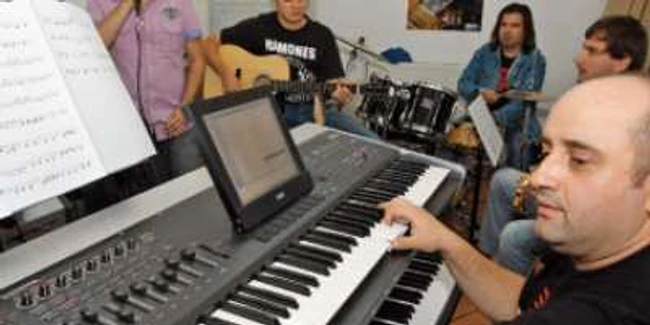 Chitaristul Viorel Dodoc, unul dintre fondatorii trupei, stă în dreapta, sub un calendar pe 2009 cu Jukebox. Lângă el, între un afiş cu o fată îmbrăcată în culorile steagului britanic care ţine o chitară şi un calendar scris de mână cu cântările din iunie şi iulie, stă Sergiu Moldovan, cel mai proaspăt membru al trupei, şi seturile lui de clape.