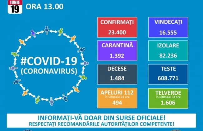 „Până astăzi, 19 iunie, pe teritoriul României, au fost confirmate 23.400 de cazuri de persoane infectate cu virusul COVID – 19 (coronavirus). Dintre persoanele confirmate pozitiv, 16.555 au fost declarate vindecate şi externate. Până astăzi, 1.484 persoane diagnosticate cu infecţie cu COVID-19 au decedat. În intervalul 18.06.2020 (10:00) – 19.06.2020 (10:00) au fost înregistrate 11 decese (6 bărbaţi şi 5 femei), ale unor pacienţi infectaţi cu noul coronavirus, internaţi în spitalele din Botoşani, Brăila, Braşov, Dâmboviţa Dolj, Iaşi, Bucureşti, Sălaj, Sibiu şi Vrancea. Dintre acestea, 3 decese au fost înregistrate la categoria de vârstă 50-59 ani, 1 deces la categoria de vârstă 60-69 ani, 4 decese la categoria de vârstă 70-79 ani, şi 3 decese la persoane de peste 80 de ani. 10 dintre decese sunt ale unor pacienţi care au prezentat comorbidităţi. Pentru 1 deces nu au fost raportate comorbidităţi”, conform raportului transmis vineri.