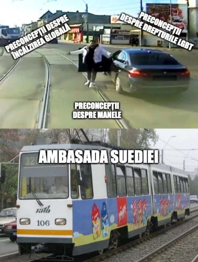 După postările virale cu Dana Budeanu, Ambasada Suediei ia parte şi în noul episod al conflictului „tramvai vs BMW”. Tramvaiul 32, cel care a lovit BMW, este identificat cu ambasada ţării nordice, în timp ce BMW şi reprezintă „victimele” acesteia pe pagina de Facebook, preconcepţii despre manele, despre încălzirea globală sau despre drepturile persoanele LGBT.