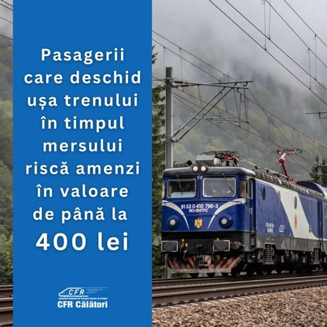Concret, cei care deschid ușa trenului în timpul mersului riscă amenzi cuprinse între 250 și 400 de lei, conform HG 203/1994, art. 2, pct. 16, potrivit anunțului CFR.