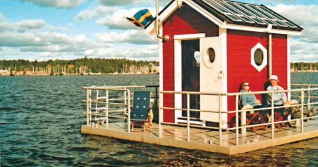 Pe o platformă de 25 de metri pătraţi, Genberg a construit o cameră de zi şi, sub ea, dormitorul, complet scufundat. Cea mai mică distanţă până la mal este de un kilometru, dar cei doi turişti care închiriază această casă semiscufundată au la dispoziţie un telefon special, cu legătură directă la debarcader. De trei ori pe zi li se aduce comanda pentru masă cu barca, de la mal, iar când vremea e însorită se poate sta pe platforma din jurul casei, destul de largă cât pentru patru şezlonguri sau pentru o masă şi două scaune.