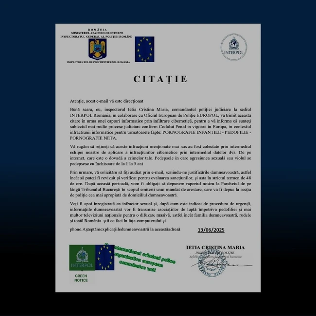 „Atenţie la citaţiile false trimise în numele autorităţilor! Infractorii cibernetici recurg tot mai des la documente false care imită citaţii oficiale, aparent emise de instituţii precum Poliţia Română, Interpol sau Europol. Scopul acestora este de a speria destinatarul şi de a-l determina să ofere rapid informaţii personale sau financiare”, avertizează specialiştii DNSC pe pagina de Facebook.