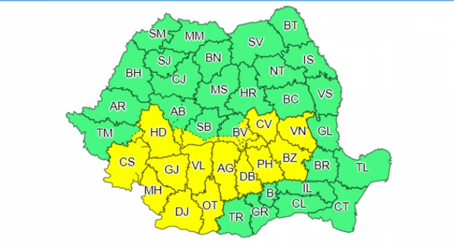 Judeţele vizate de această atenţionare meteorologică sunt Alba, Argeş, Braşov, Buzău, Caraş-Severin, Covasna, Dâmboviţa, Dolj, Gorj ,Hunedoara, Mehedinţi, Olt, Prahova, Sibiu, Timiş, Vâlcea şi Vrancea.