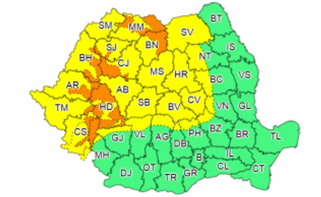 Începând de marţi după-amiază, în zona montană din judeţele Cluj, Sălaj, Bihor, Arad, Timiş, Hunedoara, Maramureş, Bistriţa-Năsăud şi Caraş-Severin este Cod portocaliu de precipitaţii abundente. Miercuri dimineaţă, vor intra sub incidenţa Codului galben de intensificări ale vântului şi ninsori viscolite şi Moldova şi, local, Muntenia şi Dobrogea.