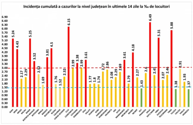 Coeficientul infectărilor cumulate la 14 zile, raportate la 1.000 de locuitori este calculat de către Direcţiile de Sănătate Publică, la nivelul Municipiului Bucureşti şi al judeţelor. Mai jos aveţi graficul realizat în baza raportărilor primite de CNCCI de la Direcţiile de Sănătate Publică: