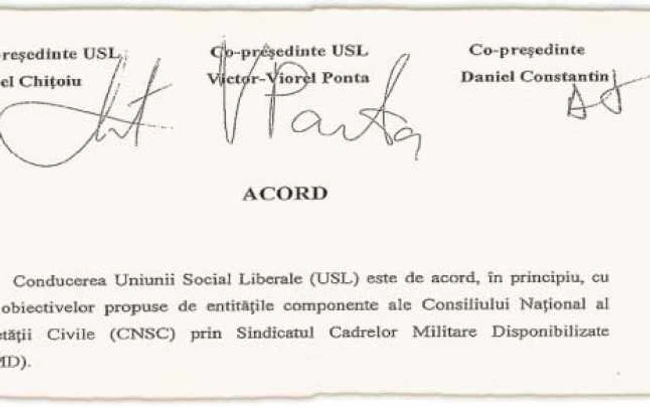 Acordul este semnat, din partea USL, de copreşedinţii Victor Ponta (PSD), Daniel Chiţoiu (PNL) şi Daniel Constantin (PC), iar din partea CNSC de către Mircea Dogaru, preşedintele Sindicatului Cadrelor Militare Disponibilizate. De remarcat că primii trei fac parte şi din Guvernul României.