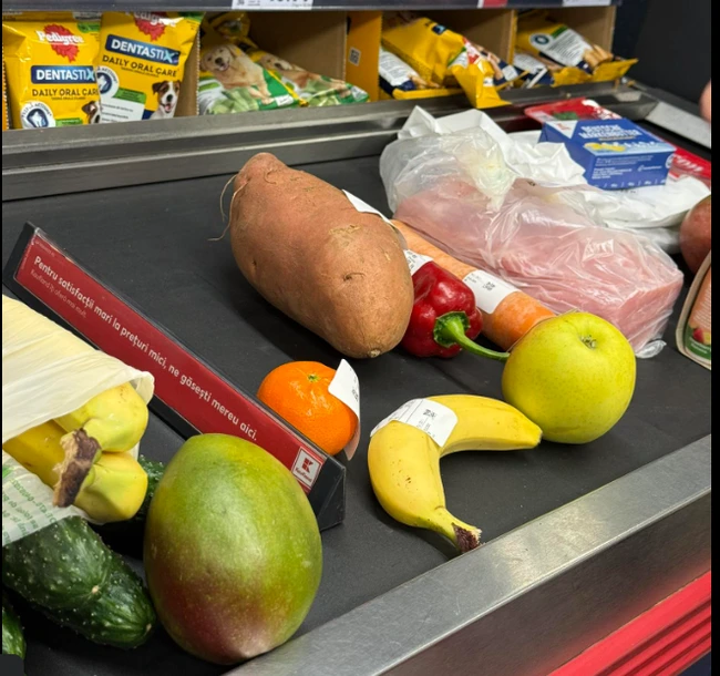 0O fotografie surprinsă pe banda unei case de marcat dintr-un magazin a devenit virală pe Facebook și a stârnit un val de reacții emoționale. În imagine apar câteva produse: o banană mică, o mandarină, un măr, un morcov, un ardei roșu și un cartof dulce.